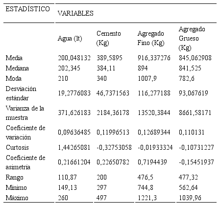 (12)En el análisis descriptivo para ambos métodos las variables Agua, Cemento y Agregado Fino presentaron similar comportamiento en el histograma y en cuanto a simetría, mientras que el Agregado Grueso fue diferente. Existe dispersión baja e intermedia con tendencia hacia la baja para todas las variables objeto de estudio, es decir, poca variabilidad, lo que refleja que las distribuciones de probabilidades obtenidas son acertadas y, lo más importante, demostrables técnica y científicamente con la ciencia estadística a través de su teoría de probabilidad y teoría del muestreo.