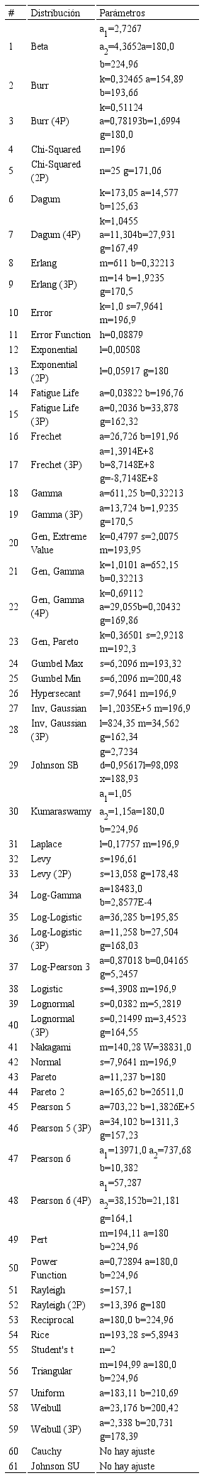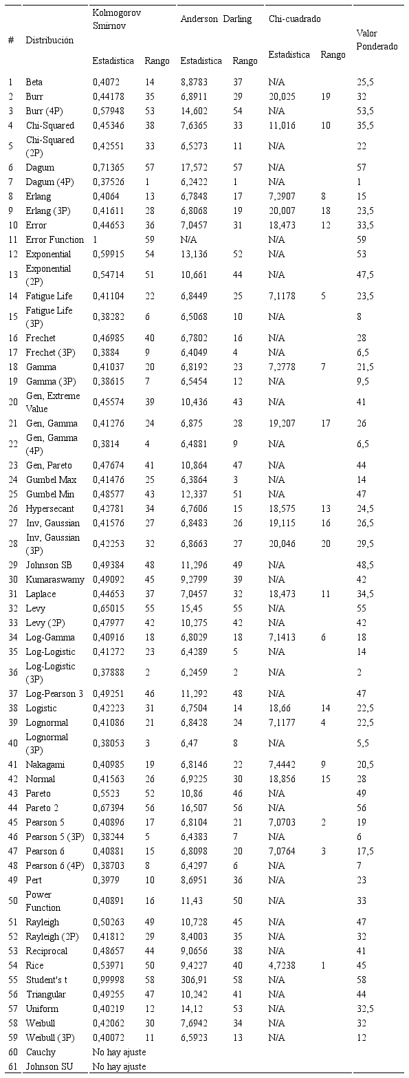 La Tabla 3 indica el orden de ajuste de las distribuciones, el número 1 indica que es la que tiene el mejor ajuste según cada test de prueba. Con el fin de considerar los test de Kolmogorov-Smirnov y Anderson-Darling simultáneamente, se realizó una ponderación del rango de estos para estimar las cinco distribuciones que tienen mejor ajuste con los datos. Tal como se aprecia en dicha tabla, la prueba chi-cuadrado no aplica para muchas de las distribuciones que maneja el programa por lo que sus resultados no se tomaron en cuenta para el análisis. Se señalan en rojo las cinco distribuciones que mejor se ajustan al grupo de datos respecto a cada test de bondad.
