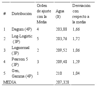 La Tabla 9 muestra las cinco distribuciones con las primeras posiciones en el ajuste luego de la ponderación respecto a los test de bondad, las cuales para la variable Agua son: Hypersecant, Error, Log-Logístic (3P), Burr y Johnson SU. Calculando la cantidad de agua con estas cinco distribuciones para un nivel de confianza de 0,95 y comparando esos valores con su media, se estableció un nuevo orden de ajuste que considera la desviación con respecto a la media, en este caso, la distribución de probabilidades que más se aproxima al valor medio estimado es la distribución Hypersecant o Secante Hiperbólica cuyos parámetros son: σ = 19,278 y µ = 200,05.
