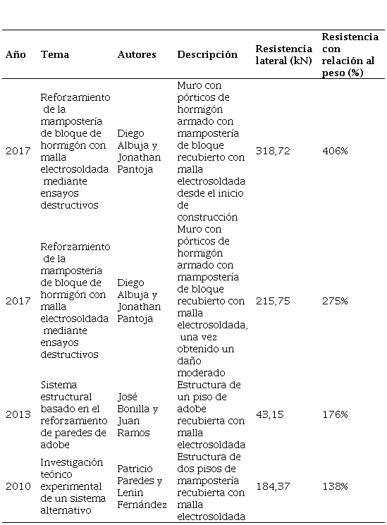 En el CIV se ha venido estudiando este sistema de manera analítica como experimental, tanto en muros como en estructuras, con lo cual se ha podido calibrar modelos matemáticos y tener resultados cercanos a la realidad. En la Tabla 1, se muestran 4 investigaciones realizadas en el CIV con sistema de enchape, la primera un muro que inicia con el sistema, el segundo un muro de pórticos rehabilitado y combinado con el sistema de enchape y los dos últimos son de dos estructuras aplicando este sistema.