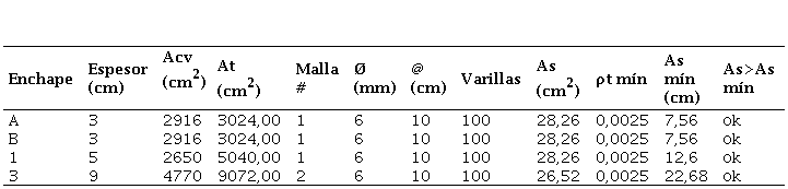 Conociendo la resistencia del hormigón, así como el acero de la malla se comprobó el acero mínimo colocado para reforzar la mampostería, y también si este cumple con la resistencia a corte. En la Tabla 3 y 4 se puede observar que la mampostería enchapada cumplió con el acero mínimo requerido y además con la resistencia a corte.
