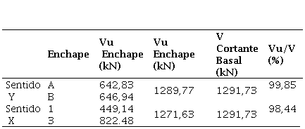 Como se mencionó previamente se planteó reforzar los ejes A, B, 1 y 3, mientras que los demás ejes mantuvieron los pórticos. Para ver el aporte del enchape a la estructura se revisó cuanto cortante absorben para los diferentes sismos y se comparó con el cortante basal de toda la estructura. En la Tabla 5 se puede observar que el enchape absorbió el 99 % del cortante basal de toda la estructura.