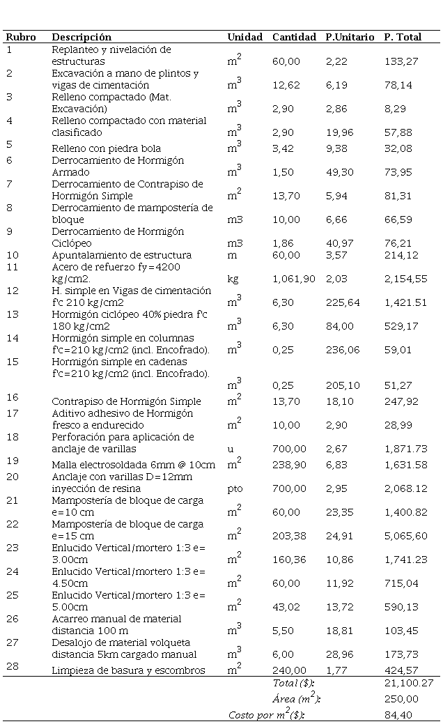 Para ver los costos por metro cuadrado del reforzamiento con enchape se realizó un presupuesto, mismo que considera trabajos preliminares, movimiento de tierra, demoliciones, apuntalamientos, estructura principal, mampostería debido a que la estructura aún no estaba terminada. Obteniendo un costo alrededor de los 80 dólares por metro cuadrado sin considerar acabados, como se muestra en la Tabla 6.