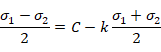 (1)Conforme a lo propuesto por Mohr, si se consideran como ordenadas los esfuerzos cortantes,t, que actúan sobre las superficies de corte trazadas en las diferentes orientaciones, y como abscisas los correspondientes esfuerzos normales, s, entonces todos los estados tensionales están representados con puntos de una región delimitada exteriormente por un círculo de diámetro s1 - s2 y centro en el eje s. La Ec. (1), muestra como una recta, la envolvente del círculo de estados de esfuerzos, con segmento desde el origen, e intercepto en s igual a C/k, como se muestra en la Figura 2. Para el caso general donde una relación no lineal sea considerada, en lugar de la Ec. (1), la envolvente sería representada por una curva.