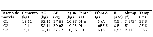 Los materiales empleados para producir el concreto fueron cemento Portland Tipo I, arena, grava, fibras de polipropileno y acero. La arena de peso específico de 2,62 kg/m3 y un módulo de finura de 2,52mm. La grava se clasificó como grava de 1" con un peso específico de 2,66 kg/m3. Para determinar el módulo de fineza se utilizó la norma ASTM C136 [14]. Los áridos de tamaño grueso y fino son procedentes de la cantera trapiche. La longitud de la fibra de polipropileno fue de 12-19mm, la absorción de agua cero y la resistencia a la tensión es de 300-400MPa, descrito en aditivos especiales [15]. La fibra de polipropileno está clasificada como fibra sintética de tipo 3 ASTM C1116 [16]. La resistencia a la rotura de la fibra de acero es de 1200MPa, aumenta la resistencia del concreto en 24 horas y es resistente al desgaste conforme indica en aditivos z [17]. La fibra de acero pertenece a la fibra de acero tipo 1 ASTM A820 [18] y la cantidad de materiales indicada en la tabla por el método de dosis de referencia ACI 211.1 [19]. En la Figura 2, presenta las fibras utilizadas, y en la Tabla 1 se muestra el diseño de mezcla.