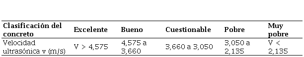 Las pruebas se llevaron a cabo de acuerdo con los procedimientos especificados en la norma ASTM C597 [22]. Los transductores del dispositivo fueron calibrados con una barra de referencia; la vaselina se usó en la superficie de la muestra del concreto para transmitir ondas ultrasónicas de manera más eficiente entre el transductor y el concreto. El equipo utilizado fue el Pundit Lab, y la longitud de propagación de la onda tenía que ser lo suficientemente para no afectar los resultados. Por lo tanto, para concretos que contengan áridos de tamaño nominal máximo de 20 a 40mm, se recomienda una longitud de 150mm. La distancia mínima de propagación ultrasónica para un transductor con una frecuencia de 54kHz es igual a 150mm [23]. Se utilizo una varilla de calibración de 25µs para el transductor con una frecuencia de 54kHz. Para cada muestra se tomaron 2 lecturas, y la clasificación del concreto se presenta en la Tabla 2.