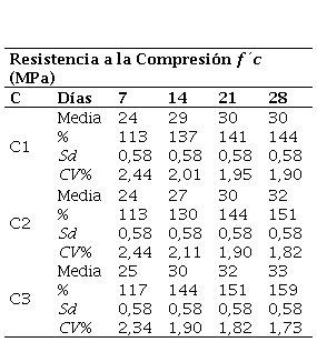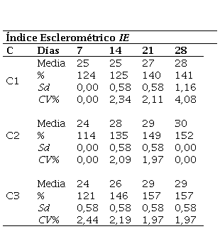 En la Tabla 5 muestra los valores IE, observándose el mayor valor de rebote es igual a 30 IE para el concreto C2 a los 28 días, mientras que el valor más bajo obtenido es de 24 IE para el concreto C2 y C3 a los 7 días. El concreto C1 tuvo el mayor valor de coeficiente de variación de 4.08% a los 28 días. Estos resultados muestran que la relación con la desviación estándar no supera el 10%, por lo que el valor de IE es bien representativo. La evaluación de datos supera el 100 % de resistencia promedio en MPa. El valor más alto es 57 % de C3 en 21 y 28 días y el valor más bajo es 14 % de C2 en 7 días.