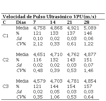 El valor máximo de la VPU para el concreto C1 a los 28 días es igual a 5,089m/s una clasificación de calidad del concreto excelente. El valor mínimo para el concreto C3 a los 7 días es de 4,579m/s una clasificación excelente. A los 7 días, el mayor valor del coeficiente de variación del concreto fue del 2,12%. Estos resultados muestran una relación con la desviación estándar de no más del 10%, por lo tanto, tenemos valores de VPU bien representativos. La evaluación superó el 100 % de resistencia promedio en MPa, el valor más alto fue 57% de C3 a los 28 días y el valor más bajo fue 16% de C2 a los 7 días. En la investigación de S. Kilmartin-Lynch, M. Saberian, J. Li, et al. [1] a modo de comparación los resultados de VPU mejoraron hasta que el volumen alcanzó el 0,20%, tras lo cual disminuyó ligeramente con el 0,25% de polipropileno. En la Figura 4 se muestra la evolución de los resultados de la velocidad del pulso ultrasónico a través de las etapas de curado. Las barras verticales representan la VPU, sin embargo, los resultados obtenidos en cada diseño son representativos.