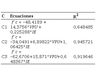 Se propuso un estudio de análisis estadístico de regresión lineal múltiple empleando Statgraphics Centurion XVI para obtener la línea de regresión y el modelo de R2, para el análisis de correlación a fin de estimar f´c. Se consideró como variable dependiente f´c y como variables independientes la VPU y el IE. Se utilizo la ecuación de mínimos cuadrados sugerido según N. R. Chandak y K. Hemraj R en el método SonReb [33], tal como se describe en la Tabla 6.