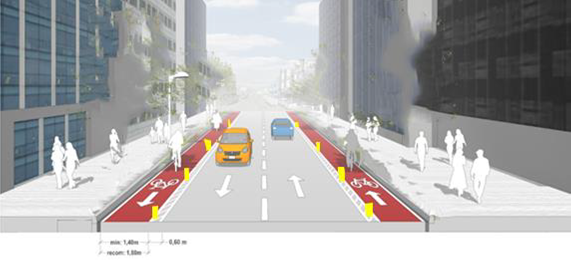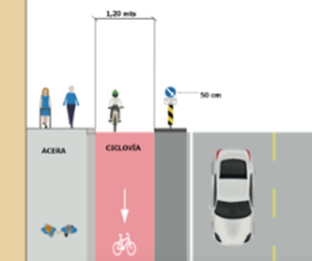 Así mismo, la infraestructura ciclovíal se diseña lo más próxima al carril de baja velocidad, de forma unidireccional, en el mismo sentido de circulación del tránsito automotor y procurando alta visibilidad en las intersecciones. Para el caso de la ciclovía unidireccionales se propone para que sea factible su emplazamiento sobre la acera y arriate, siempre deberá ser mayor o igual a 3,2m de ancho. Las ciclovía unidireccionales o bidireccionales son factibles en su emplazamiento sobre el rodaje, cuando estos cuentan con un ancho suficiente para albergar la ciclovía junto con los volúmenes de carga vehicular con el que cuenta la vía. En la Figura 4, se muestra cómo ha de intervenirse el rodaje con ciclovía, de forma que esta se encuentre en colindancia con el derecho de vía (acera y arriate) y con elementos de seguridad que protejan al ciclista durante su recorrido.