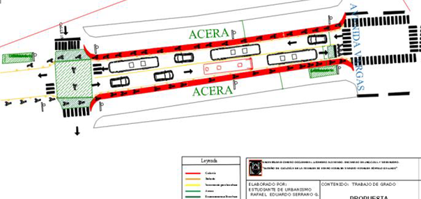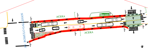 Para el tramo entre Avenida Vargas y Avenida 20 la estrategia aplicada para la redistribución de la vialidad consiste en reducir los canales de circulación a 3,30m para ubicar un canal unidireccional al extremo derecho de la vía de 1,50m de ancho y un espacio de 0,30m para la delimitación visual mediante un rayado doble, y de 0,50 para incorporar los bolardos los que serán de barrera de los vehículos motorizados. Esto se aplicaría también en el tramo Avenida Rómulo Gallego, y Avenida 20 (ver Figura 8).