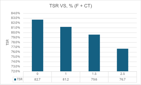En la Figura 8 indica que la resistencia a la Tracción Indirecta (TSR) de la briqueta va disminuyendo cuando incrementa el porcentaje de los modificadores, en el ensayo de TSR la muestra patrón dio resultado de 82,75, al añadir el 1,0%, 1,5% y 2,5% los valores de TSR son 81,2%, 79,6% y 76,7% respectivamente.