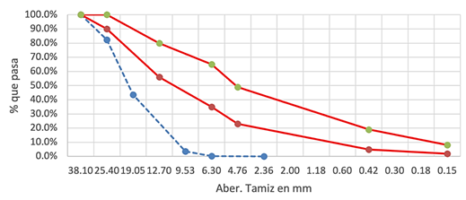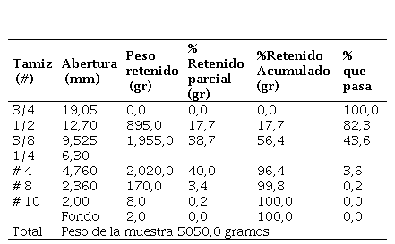 La Tabla 2 muestra el análisis granulométrico o ensayos en las partículas de agregado grueso para determinar los tamaños nominales máximos y mínimos. Esta evaluación es crucial para el diseño de mezclas homogéneas, especialmente en el caso de mezclas asfálticas en caliente, donde el tamaño de las partículas afecta directamente las propiedades mecánicas y estructurales del pavimento.