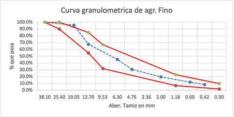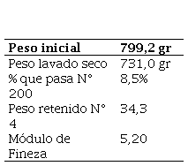 En la Figura 3, correspondiente a la medición granulométrica del agregado fino, se puede observar que la distribución de tamaños de partículas cumple con los límites especificados en la normativa vigente, caracterizándolo como un material no plástico. Asimismo, el porcentaje acumulado resaltado a través de la malla N°200 es de 9,3%, lo que indica la presencia de una fracción de limo en el material.