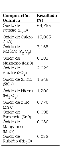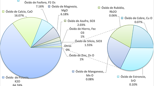 En la Figura 4 Los compuestos químicos obtenidos en el ensayo de rayos X son representativos de acuerdo con la muestra extraída, dando como resultado que el 64,74% es de óxido de potasio (K2O), seguido por el óxido de calcio (CaO) en un 16,07%, y 7,16% de óxido de fósforo (P2O5), además el 6,18% es del óxido de magnesio (MgO) y menor al 5% son los otros componentes que se presentan en la Figura 4.