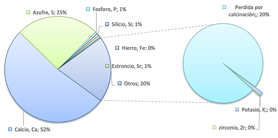 En la Figura 5 los análisis químicos del Fibrocemento demuestran que, al realizar la calcinación para obtener la cantidad de los resultados de los elementos químicos, se ve que pierde proporciones, es decir pierde peso a lo de su estado de llegada. Pero al realizar el ensayo las cantidades que prevalecen en la muestra son el calcio con 52% y azufre con 25%, entre los demás elementos como; fosforo, silicio, hierro, estroncio, potasio y zirconio, que son menores al 1%.