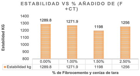 En la Figura 6, a gráfica de barras indica que los valores de estabilidad Marshall que tiene una variación cuando se mezcla con fibrocemento y ceniza de tara; al añadir los porcentajes de 1%, 1,5% y 2,5% la estabilidad es 1271,9 kg, 1198,0 kg, 1256,0 kg respectivamente, siendo el valor máximo de la estabilidad patrón (P).
