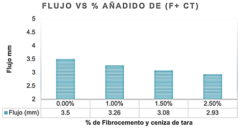 En la Figura 7, la gráfica de barras indica los valores del flujo Marshall de los especímenes fabricados, al añadir el Fibrocemento y Ceniza de tara en los porcentajes de 1%, 1.5% y 2,5%; los flujos son 3,26 mm, 3,08 mm y 2,93 respectivamente, siendo mayor el flujo de la muestra patrón (P).