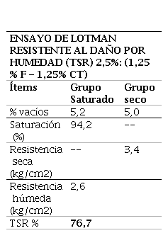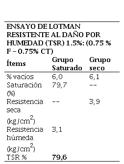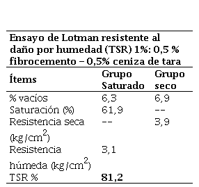 En la Tabla 13 se registra ultima adición de 2,5% de fibrocemento y ceniza de Ceaselpina Spinosa demuestra que añadiendo estos componentes su resistencia húmeda reduce en un 2,6 kg/cm2 y el TSR 76,7%. Los ensayos con respecto al daño producido por la humedad demostraron que al utilizar el fibrocemento y ceniza de tara cuando las briquetas fueron sometidas a la saturación con agua, los valores de TSR en el patrón es de 82,7%, mientras que con el 1% de (F + CT) es de 81,2%, con 1,5 % de (F + CT) es de 79,6% y 76,7% cuando se añade el 2,5% de (F + CT).