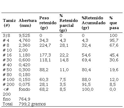 Y en la Tabla 4 se aprecia la granulometría de agregado fino, se consideró como muestra una cantidad de 799,2 gramos donde se determinó los tamaños de acuerdo con los tamices; se observa que el tamaño mínimo de agregado está en el tamiz #200 con un 8,5% de acumulado que pasa.