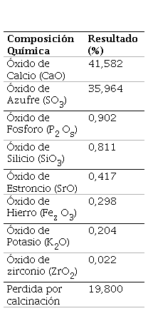 Para determinar la composición química de la ceniza de Caesalpinia Spinosa denominada vulgarmente Tara, el ensayo se realizó en el laboratorio Slab, (Sistema de servicios y análisis químicos S.A.C), se utilizaron 50 gramos de ceniza enfriada a temperatura ambiente. El ensayo se realizó en Talavera, Perú, donde la temperatura alcanza los 6 ºC y la humedad relativa es del 58%. Se evidencia en la Tabla 6 el orden en como el laboratorio presenta los óxidos, este ensayo se realiza con la metodología fluorescencia de rayos x, el barrido se realiza con Na a U y con un límite de detección de 0,001%.