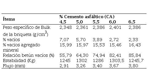 En la Tabla 8 se muestra la experimentación para el diseño de la mezcla, se consiguió determinar el porcentaje óptimo de Cemento Asfáltico (CA), obteniendo así que el 5,65% de CA es la cantidad con la que se procederá la experimentación. Estos valores cumplen de forma efectiva con los parámetros establecidos en la Norma Manual de Ensayo de Materiales [16]. Para cumplir con estos parámetros se tiene que tener en cuenta que tanto en la estabilidad y el flujo Marshall cumplan con los valores estándares; siendo que con el 5,65% de CA, su estabilidad es 1289,8 kg, flujo 3,5 mm y % de vacíos el 3,4.