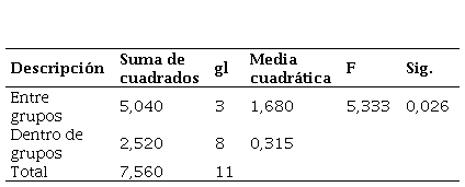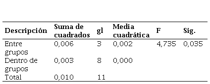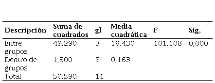 Asimismo, se realizó el análisis de varianza ANOVA [20] para el valor de soporte con la adición de CCH, estos resultados indican un valor de significancia de 0,000 el cual es menor al p. valor de 0,05 tal y como se muestra en la Tabla 9, resaltando una variación significativa entre los grupos analizados, es por ello que se rechaza la H0 y se acepta la H1 que establece que la adición de CHH genera un efecto significativo en el valor de soporte del suelo.