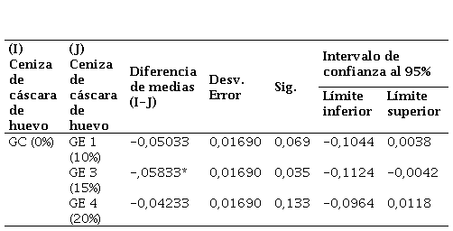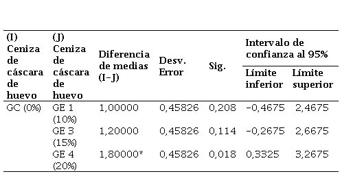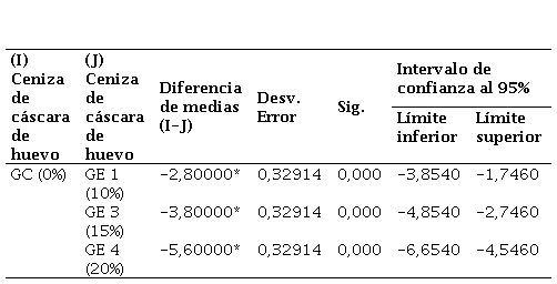 Asimismo, se realizó la comparación múltiple con el Post-Hoc de Tukey [21] para el valor de soporte con la adición de CCH, este análisis permitió comparar las medias entre los diferentes grupos experimentales identificando combinaciones con diferencias significativas. Los resultados indican que todas las comparaciones realizadas presentan valores de significancia menores a 0,05 demostrando diferencias significativas en las medias observadas entre el grupo control y los grupos experimentales, los cuales fueron progresivamente mayores a medida que se incrementó el porcentaje de CCH tal y como de evidencia en la Tabla 10. Por lo tanto, todas las adiciones han generado un mayor valor de CBR, siendo la adición el GE 3 con un 20% de CCH la que ha generado el mayor beneficio.