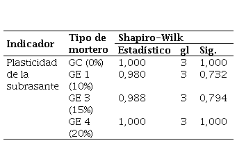 Los resultados indican que todos los valores de significancia para los subconjuntos analizados son mayores a 0,05 tal y como se muestra en la Tabla 11, sugiriendo que los valores en el indicador de plasticidad de la subrasante son completamente normales.
