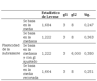 A continuación, se realizó el análisis de homogeneidad de varianzas para la plasticidad de la subrasante con la adición de ceniza de cáscara de huevo, el cual se llevó a cabo mediante la prueba de Levene [19] en la cual se establece que la H0 indica que las varianzas no son homogéneas mientras que la H1 confronta esta afirmación. Es de esta forma que los resultados indican que los valores de significancia en todas las condiciones son superiores a 0,05 como se evidencian en la Tabla 12.