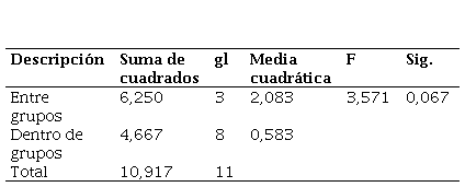 Asimismo, se realizó el análisis de varianza (ANOVA) [20] para la plasticidad de la subrasante con la adición de CCH, estos resultados indican un valor de significancia de 0,067 el cual es mayor al p. valor de 0,05 tal y como se muestra en la Tabla 13, resaltando que no existe una variación significativa entre los grupos analizados, es por ello que se acepta la H0 y se rechaza la H1, por lo que la adición de CHH no genera un efecto significativo en la plasticidad de la subrasante.