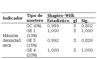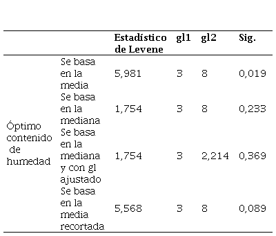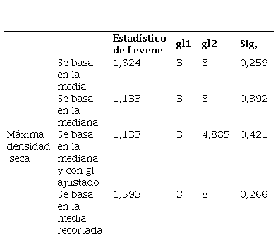 A continuación, se realizó el análisis de homogeneidad de varianzas para tanto para la MDS y la OCH de la subrasante con la adición de ceniza de cáscara de huevo, el cual se llevó a cabo mediante la prueba de Levene [19] en la cual se establece que la H0 indica que las varianzas no son homogéneas mientras que la H1 confronta esta afirmación. Es de esta forma que los resultados indican que los valores de significancia en todas las condiciones son superiores a 0,05 como se evidencian en las Tablas 16 y 17.