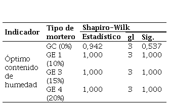 El análisis de homogeneidad para el CBR con la adición de CCH, mediante la prueba de Levene [19] en la cual se establece que la H0 no hay homogeneidad mientras que la H1 confronta esta afirmación. Es de esta forma que los resultados indican que los valores de significancia en todas las condiciones son superiores a 0,05 como se evidencian en la Tabla 8. Por lo tanto, se rechaza la H0 confirmando que las varianzas entre los grupos experimentales y de control son homogéneas.