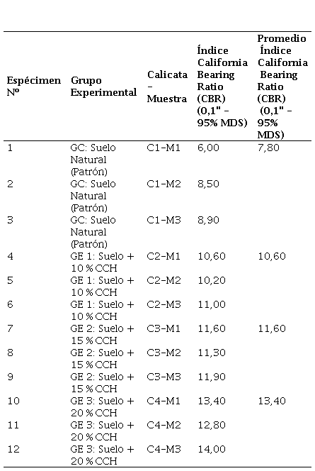 La Tabla 3 presenta los valores promedio del índice CBR obtenidos para cada grupo experimental, permitiendo una comparación clara entre las distintas proporciones de CCH utilizadas en las muestras. Estos datos reflejan directamente el impacto del aditivo en la capacidad portante del suelo, estableciendo una base cuantitativa para su análisis.