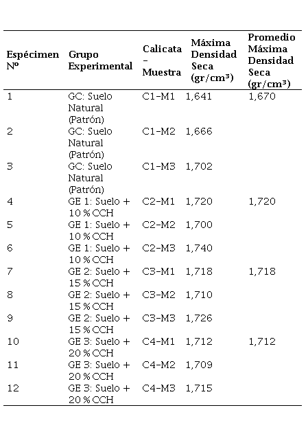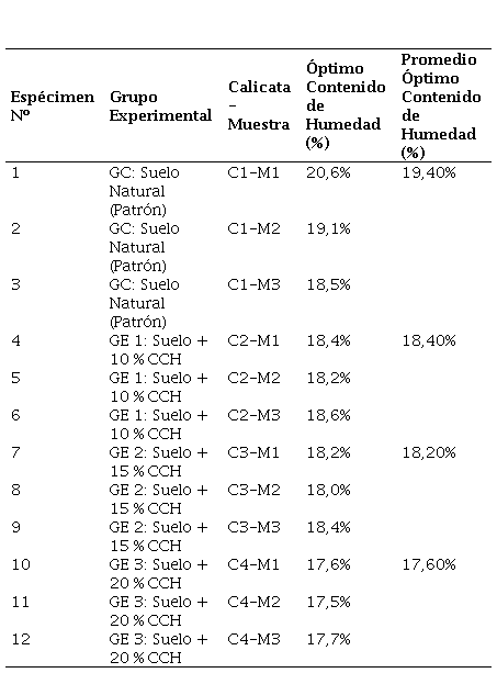 La Tabla 6 presenta los valores promedio del OCH para cada grupo experimental. Este parámetro es útil para identificar la cantidad de agua requerida para alcanzar su compactación máxima del suelo tratado.