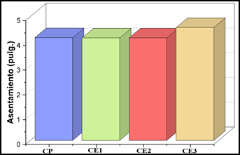 En la Figura 1 se exhibe los resultados de la consistencia del concreto, donde el patrón (CP) tuvo un asentamiento promedio de 4 pulgadas, así mismo al agregar 0,75% y 1,3% de extracto de aloe vera (CE1 y CE2), no se observaron cambios significativos en la fluidez. Sin embargo, con 1,7% de aloe vera (CE3), el asentamiento aumentó un 12,5%, mejorando la fluidez sin afectar la resistencia ni durabilidad.