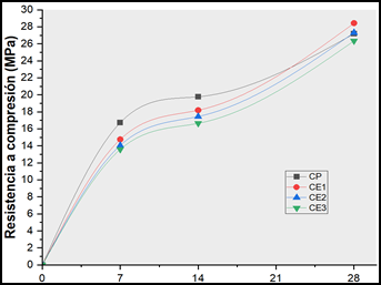 La Figura 2 muestra la resistencia a compresión a los 7, 14 y 28 días, donde a los 7 días el CP tiene la mayor resistencia, mientras que las mezclas con aloe vera, especialmente el CE3 se reducen hasta un 18,8%, debido a la hidratación de la mezcla; así mismo a los 14 días CP sigue siendo el grupo con mejor resistencia, por otro lado, a los 28 días CE1 y CE2 superan al CP con aumentos del 5% y 1% respectivamente, mientras que CE3 disminuye su resistencia.