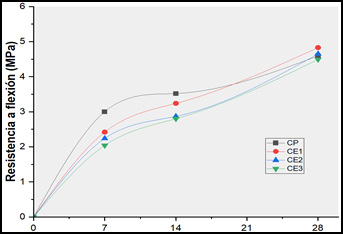 La Figura 3 muestra la resistencia a flexión 7, 14 y 28 días, donde a los 7 días el CP presenta la mayor resistencia, mientras que las mezclas con aloe vera disminuyen, especialmente CE3 que se reduce en un 32%, lo que sugiere un retraso en el desarrollo inicial, también a los 14 días CP sigue siendo el mejor grupo, por otro lado, a los 28 días CE1 y CE2 superan al CP en 5% y 1%, respectivamente, mientras que CE3 disminuye en un 2%.