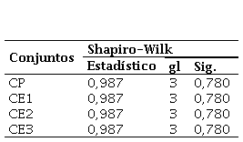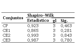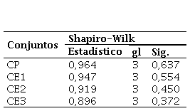 La Tabla 9 presenta los resultados del test de Shapiro-Wilk, que evalúa la normalidad de los datos. Los valores de p (Sig.) para todas las muestras (CP, CE1, CE2, y CE3) son mayores a 0,05 (p = 0,780), lo que indica que no hay evidencia suficiente para rechazar la hipótesis nula, sugiriendo que los datos siguen una distribución normal.
