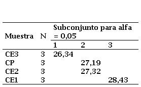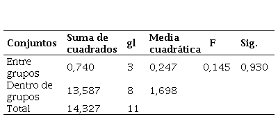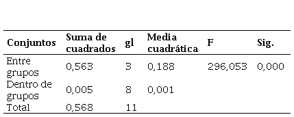 La Tabla 6 muestra el resultado del test ANOVA, que determinó si existen diferencias significativas entre las medias de los grupos, donde el valor de significancia (Sig.) fue 0,930, mucho mayor a 0,05, lo que indica que no hay diferencias estadísticamente significativas en los niveles de carbonatación entre los grupos.