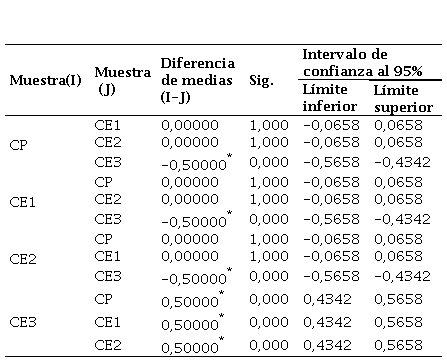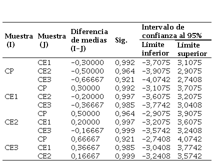 La Tabla 7 muestra la prueba Post-Hoc, que compara las medias entre todos los pares de grupos. Ninguna de las comparaciones presenta un valor de significancia (Sig.) menor a 0,05, lo que confirma que no hay diferencias significativas entre los grupos. Además, todos los intervalos de confianza incluyen el 0, lo que refuerza la conclusión de que las diferencias observadas son mínimas y no significativas.