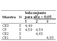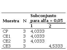 La Tabla 23 muestra el análisis de subconjuntos de Tukey HSD, donde CE1 (0,75%) tiene la media más alta en resistencia a flexión (4,83), seguida de CE2 (1,3%) con 4.65, CP (4,59) y CE3 (1,7%) con 4,49. Estos resultados indican que CE1 (0,75%) tiene el mejor desempeño, mientras que CE3 (1,7%) presenta la menor resistencia.