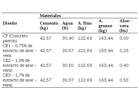 En la Tabla 1 se exhibe todas las mezclas, la cantidad de cemento se mantiene constante en 42,57 kg, donde la cantidad de agua disminuye ligeramente conforme aumenta el porcentaje de aloe vera, pasando de 34,23 litros en el concreto patrón (CP) a 30,37 litros con 1,7% de aloe vera, debido a que el aloe-vera reemplaza parte del agua.