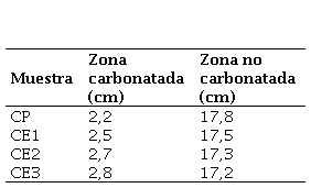 La Tabla 8 presenta los valores promedio de carbonatación para cada grupo CP (concreto patrón) 2,1667 cm, CE1 (0,75%) 2,4667 cm, CE2 (1,3%) 2,6667 cm y CE3 (1,7%) 2,8333 cm.