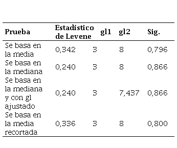 En la prueba basada en la media, el estadístico de Levene es 0,342 y el p-valor es 0,796, lo que indica varianzas homogéneas entre los grupos. Así mismo ocurre en las pruebas basadas en la mediana y con grados de libertad ajustados, con estadísticos de 0,240 y p-valores de 0,866, sugiriendo homogeneidad.