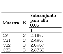 La Tabla 19 muestra los resultados de la prueba de Shapiro-Wilk, que evaluó la dispersión normal de los datos, esenciales para el ANOVA. Así mismo los valores de p (Sig.) para CP, CE1, CE2 y CE3 fueron 0,363; 0,554, 1,000 y 0,637, todos mayores que 0,05, lo que indica que los datos siguen una dispersión normal.