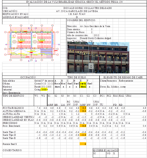 Cabe resaltar que, en evaluaciones de edificaciones educativas en ciudades del Perú, Soto Raico [16] encontró que del análisis por el Método FEMA P-154 la estructura obtuvo un puntaje de 4 por lo que no requiere un estudio detallado. Así mismo, F. Rodríguez, [17] determinó que la IEP Nº 86269 María Auxiliadora y IEP Nuestra Señora de las Mercedes, por los métodos de vulnerabilidad un nivel no vulnerable en ambos instituciones educativas y respectivos pabellones en estudio. El estudio realizado por J. Burga y J. Goicochea [18] determinó que las instituciones educativas con la aplicación del Método FEMA P-154, presentan vulnerabilidad alta con un 39,81%, vulnerabilidad baja con un 0,06%. Así también Q. Arana [19] encontró que la I.E. N°80818 J.B.G. presenta un alto grado de vulnerabilidad sísmica.