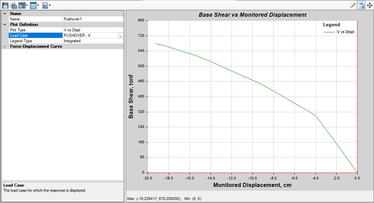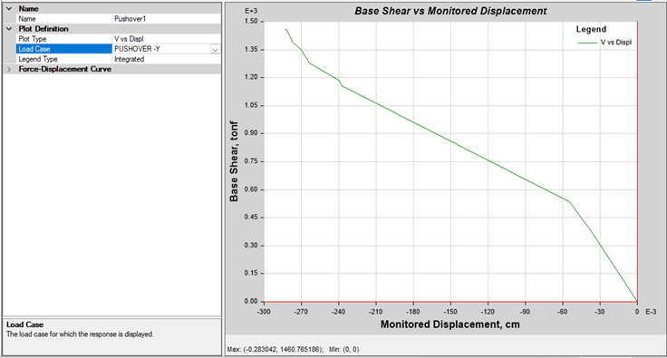 En la Figura 3 se aprecia la curva de capacidad de la estructura de la institución educativa San Juan según el método Pushover, para la dirección X, se observa el desplazamiento versus el cortante en la base de la estructura de la institución educativa, el desplazamiento máximo es de 19,23 cm y un cortante de 66509,681 kN, en este momento la estructura se encuentra en el régimen inelástico. Mientras que para la dirección Y, se observa en la Figura 4 el desplazamiento versus el cortante en la base de la estructura de la institución educativa, el desplazamiento máximo de 0,28 cm y un cortante de 14325,211 kN, en este momento la estructura se encuentra en el régimen inelástico próximo al colapso.