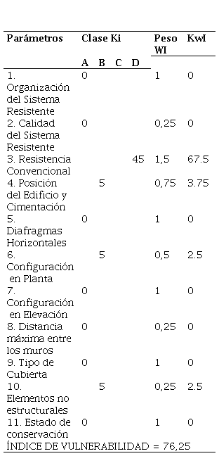 Se emplean formularios que constan de 11 parámetros y se realizan según su sistema estructural, brindando un valor denominado índice de vulnerabilidad [2]: