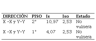 En la Tabla 3 se observa que el índice de vulnerabilidad es de 4,07 en el primer piso, y de 10,97 en el segundo piso, el índice de juicio estructural en ambos pisos es de 2,53, por lo que de acuerdo al Método de Hirosawa el Is, es mayor al Iso, por lo tanto, la estructura es No Vulnerable. En el caso del Método de Hirosawa, resultados opuestos obtuvieron en el estudio realizado por De la Cruz Díaz et al. [13], y E. A. Villar Gallardo et al. [14], quienes encontraron que los módulos de las instituciones educativas en algunas ciudades de Perú, son vulnerables ante acciones sísmicas, aplicando el Método de Hirosawa. Así también, el estudio realizado por Quieroz Rodriguez y Pedraza [15] quien aplicó el Método Hirosawa, obtuvo como resultados que el 49% de colegios son vulnerables y el otro 51% son seguros.